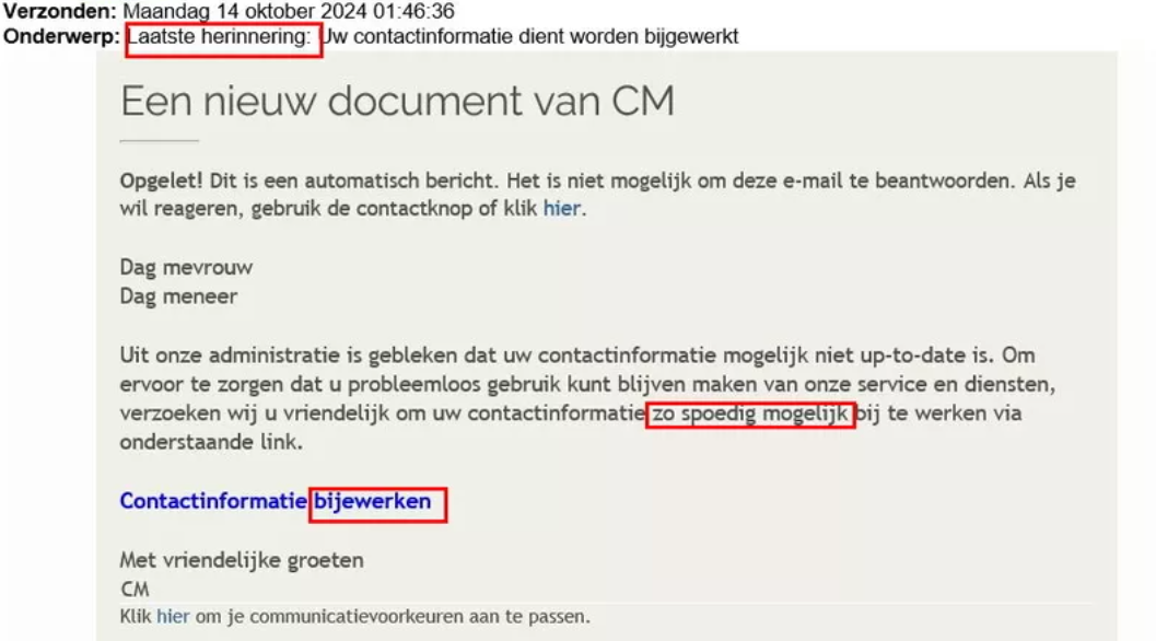 Zinnen als “Uw account wordt vandaag nog geblokkeerd” of “Direct actie vereist” zijn bedoeld om paniek te veroorzaken.
